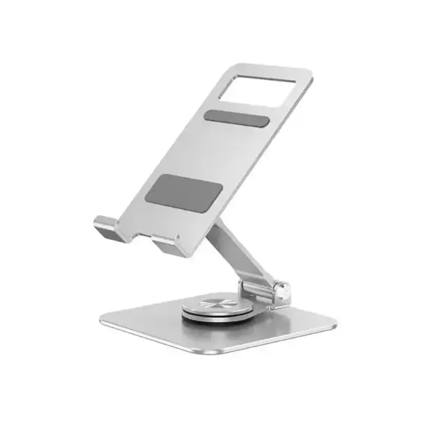 طراحی تاشو این پایه به کاربر این امکان را میدهد که آن را بهراحتی در کیف یا کولهپشتی قرار دهد و در هر شرایطی، چه در سفر، چه در دفتر کار، در جلسات آنلاین یا هنگام تماشای فیلم از آن بهره ببرد. یکی از ویژگیهای مهم آن، قابلیت چرخش ۳۶۰ درجهای است که به شما این اختیار را میدهد تا زاویه دید دستگاه خود را به دلخواه تنظیم کنید. این ویژگی در کنار قابلیت تنظیم ارتفاع، استفاده از دستگاه در حالت نشسته یا ایستاده را آسان میکند.