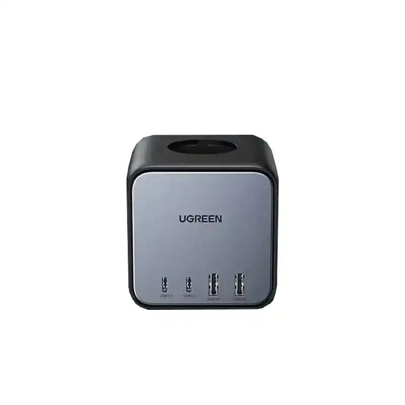 شارژر رومیزی یوگرین مدل CD268، یک شارژر 7 در 1 است که به شکل یک مکعب براق و مدرن طراحی شده است. در جلوی این مکعب، دو درگاه USB-A با قابلیت Quick Charge (QC) و دو پورت USB-C با فناوری Power Delivery (PD) قرار دارند که امکان شارژ سریع و بهینه دستگاههای شما را فراهم میکنند. علاوه بر این، سه پریز برق متناوب (AC) سه شاخه در کنارههای بالا، چپ و راست آن تعبیه شدهاند تا بتوانید لوازم برقی دیگر خود را نیز به راحتی به آن متصل کنید. در پشت مکعب نیز، یک کلید برق برای روشن و خاموش کردن دستگاه وجود دارد.